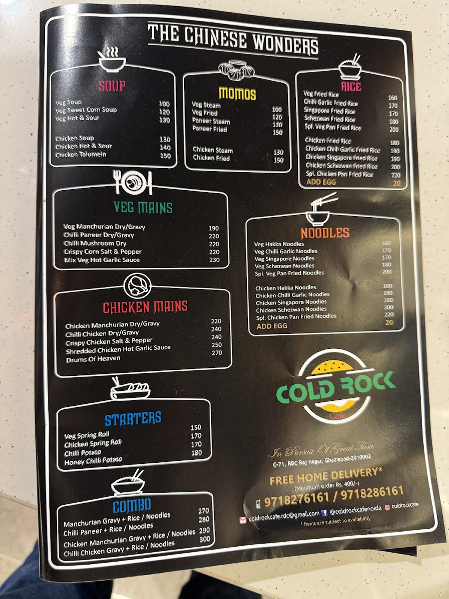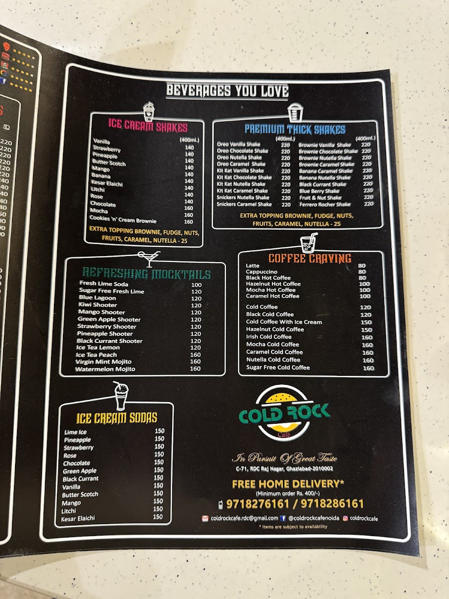 Welcome to Cold Rock Cafe, your go-to spot nestled in the heart of Raj Nagar, Ghaziabad. This delightful café stands out not just for its inviting ambiance but also for its carefully curated menu that caters to various culinary cravings. Whether you're in the mood for a rich Italian pizza or a bowl of comforting Chinese noodles, Cold Rock has something to tantalize your taste buds.